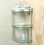 • une étagère d’angle à trois niveaux pour salle de bain.